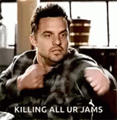 Nick Miller from New Girl makes aggressive air punching motions, declaring he's 'killing all your jams'.