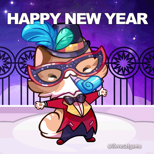 A festive cartoon cat in a top hat and mask celebrates Happy New Year with confetti and a party horn.