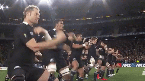 The New Zealand Rugby team performs the powerful Haka dance on the field before a match.