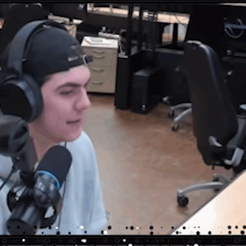 a man wearing headphones is talking into a microphone in an office