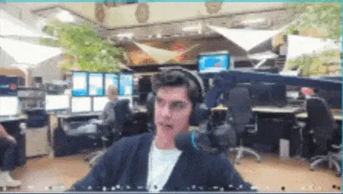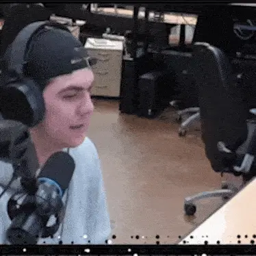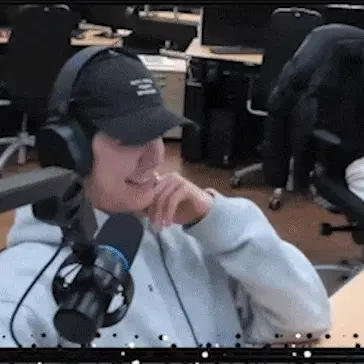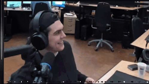 a man wearing headphones and a hat is smiling in an office