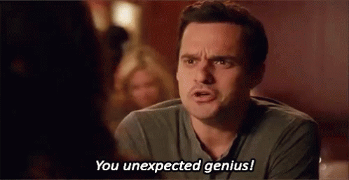 A man from New Girl exclaims 'You unexpected genius!' to a woman during a conversation.
