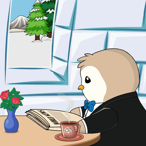 A dapper penguin in a suit reads a newspaper with coffee and roses, overlooking a snowy scene.