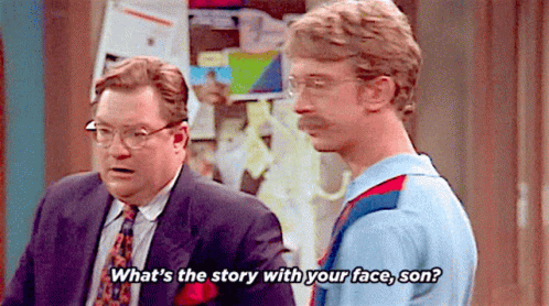 Stephen Root as Jimmy James questions a man about his face on News Radio Wnyx.