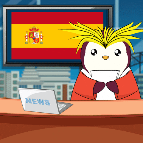 A pudgy penguin with yellow hair delivers the news from a desk, with the Spanish flag displayed on a screen behind it.