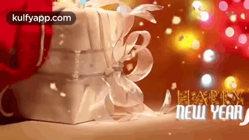 A festive animated greeting card with a gift box and sparkling lights, wishing 'Happy New Year'.