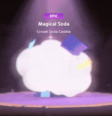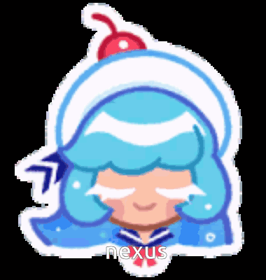 Animated pixel art sticker of Cream Soda Cookie from Cookie Run, featuring blue hair and a cherry hat.