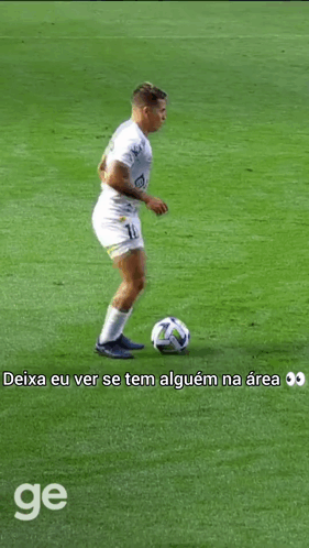 Santos FC player Soteldo pauses with the ball, looking around the area, with Neymar Jr also associated with the club.