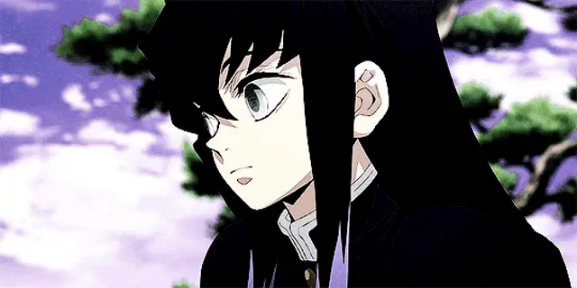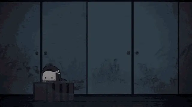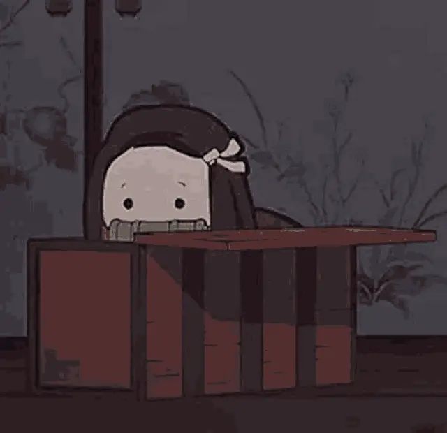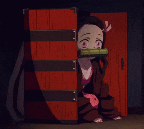 Nezuko Kamado from Demon Slayer peeks out from a red wooden box, holding her bamboo muzzle.