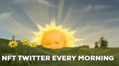 The Teletubbies baby sun meme with text 'NFT TWITTER EVERY MORNING', related to Horuscrypto.