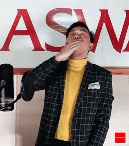 Keizo yawns widely in a studio, wearing a yellow turtleneck and plaid jacket, with a microphone nearby.