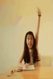 Ngọc Thảo, full of excitement, raises her arms in joy while sitting at a table.