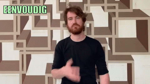 Man demonstrates a Dutch Sign Language (NGT) gesture for 'simple' in front of a patterned wall.