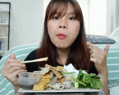 Anh Thư enjoys a delicious meal of Bún Đậu Mắm Tôm, eating with chopsticks and making expressive faces for the camera.