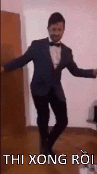 Man in a tuxedo and bow tie dances happily after finishing exams, celebrating with energetic moves.