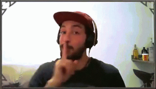 A man wearing a cap and headphones makes a 'shhh' gesture, followed by an expressive 'mimimi' hand gesture, conveying mockery or sarcasm.