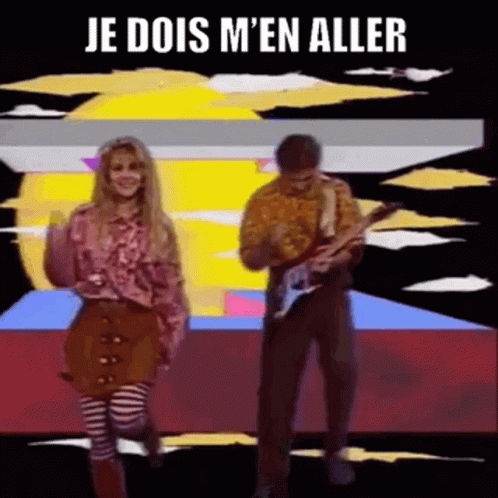 Niagara performs 'Je Dois M'en Aller' with a woman dancing and a man playing guitar in an 80s music video.