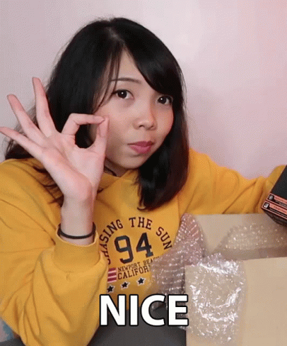Kristel Cua, wearing a yellow sweatshirt, gives an "OK" sign with a smile, with "NICE" text on screen.