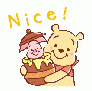 Winnie The Pooh holds a honey pot with Piglet inside, both smiling happily as 'Nice!' appears.