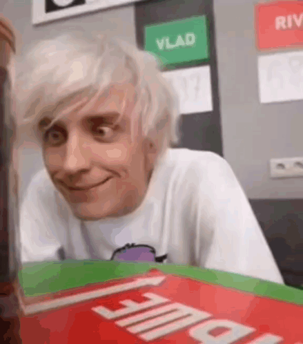 Vlad A4 reacts with wide-eyed surprise to something off-camera, looking intently at a jar of beans.