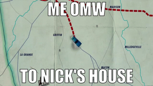 Animated map meme showing a route to Nick's house in Florida, with the text 'ME OMW TO NICK'S HOUSE'.
