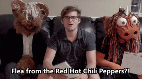 Nick Lutsko reacts to the idea of Flea from the Red Hot Chili Peppers, flanked by two unique costumed characters.