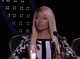 Nicki Minaj, a judge on a talent show, gives a subtle, unimpressed reaction while sitting at a microphone.