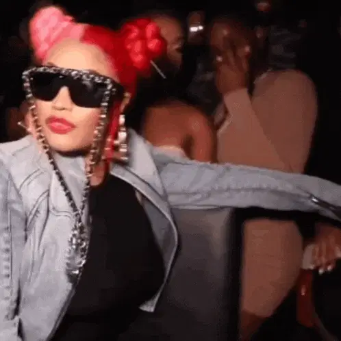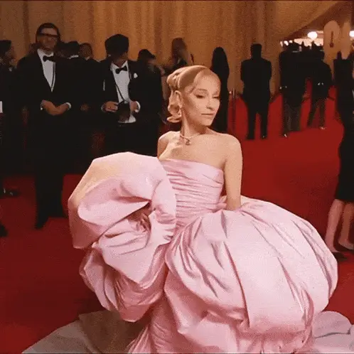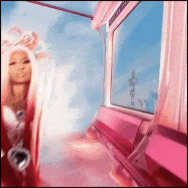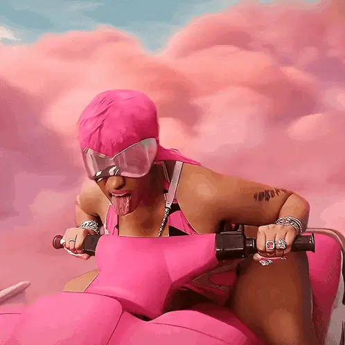 Nicki Minaj as Barbiaminaj in a stunning pink gown, standing in a dreamlike, arched setting.