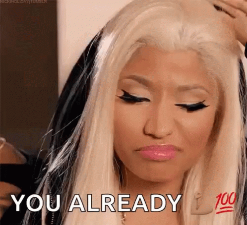 Nicki Minaj smirks and adjusts her blonde hair, with the text 'YOU ALREADY 💯' displayed on screen.