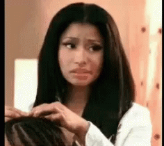 Nicki Minaj shows a look of disgust while touching someone's hair, possibly a child's.