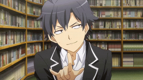 Anime character performs the iconic Nico Nico Nii pose with a smug expression in a library.