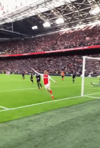 Nico Tagliafico celebrates a goal for Ajax in a vibrant stadium, acknowledging the cheering crowd.