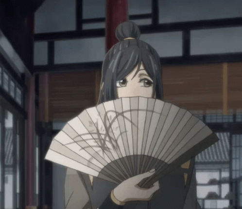 Nie Huaisang from Mo Dao Zu Shi playfully hides behind a fan, revealing a glimpse of their face in this animated scene.