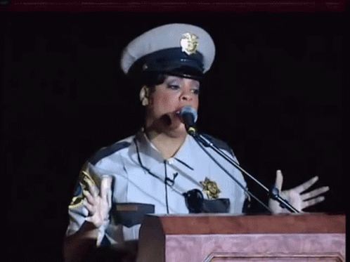 Niecy Nash as Raineesha Williams from Reno 911 performs in her deputy uniform at a podium.