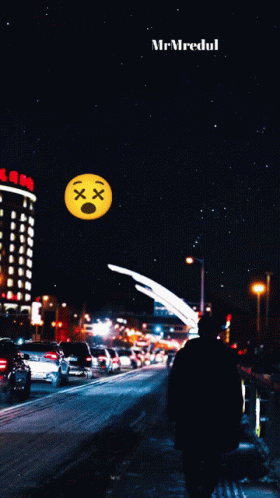 A vibrant night city street scene with traffic, pedestrians, and a dizzy emoji floating in the sky.