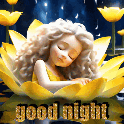 A cartoon girl with white curly hair sleeps peacefully in a yellow lotus flower, with "good night" text.