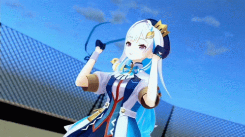Nijisanji Vtuber Lize Helesta performs a cheerful dance in her signature blue and white outfit.