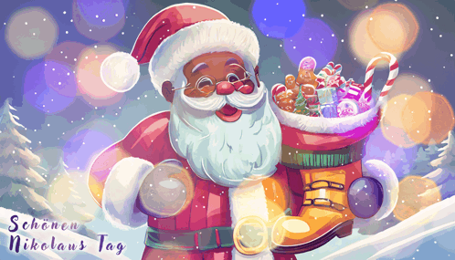 A festive illustration of Saint Nicholas holding a boot filled with glowing presents, celebrating Nikolaus Tag.