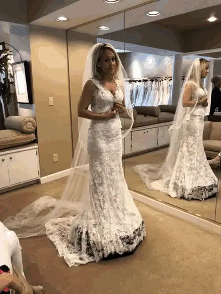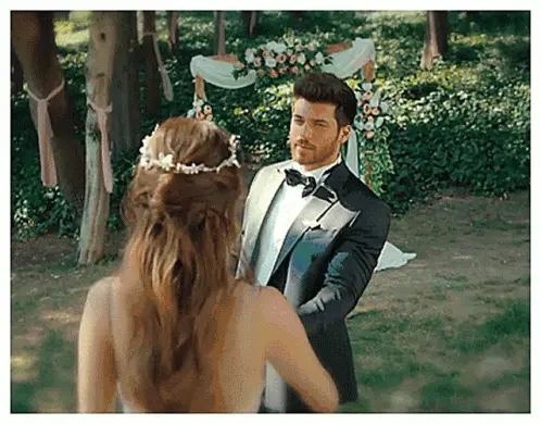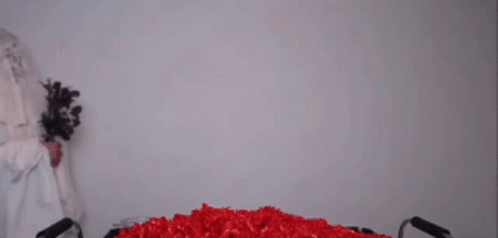 Nikocado Avocado appears as a ghostly bride holding a dark bouquet, standing before a pile of vibrant red petals.
