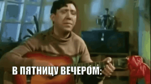 Yuri Nikulin plays guitar and sings 'Постой, паровоз' with Russian captions about Friday evening.