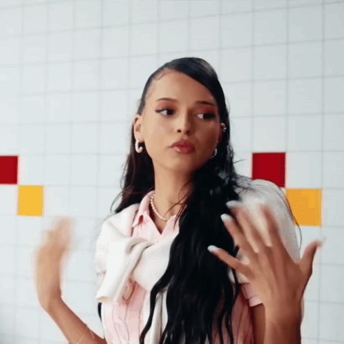 Nina Chuba, also known as Nina Katrin Kaiser, poses in a pink shirt and white sweater against a tiled wall.