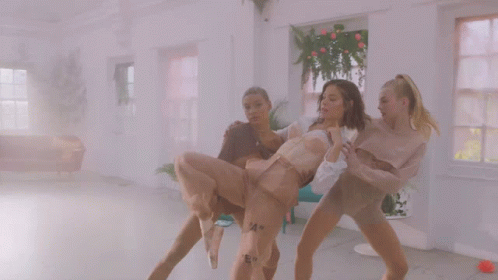 Nina Nesbitt and Sarahmcfadyen perform a contemporary dance with a third dancer in a bright studio setting.