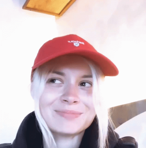 Nina Nesbitt, possibly with Sarahmcfadyen, wearing a red cap and black jacket, looking to the side.