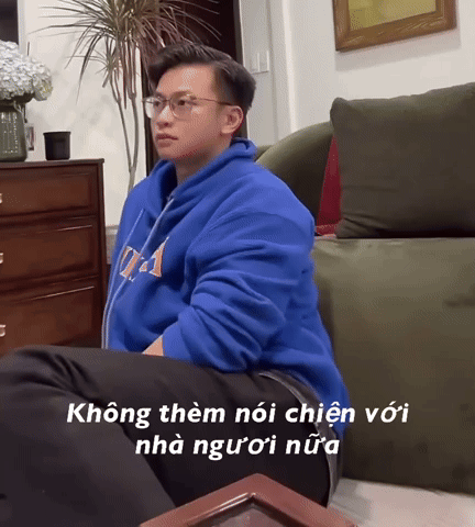 Ninh Anh Bùi, from Ninhduongstory, sits upset in a blue hoodie, with a Vietnamese caption about not wanting to talk.