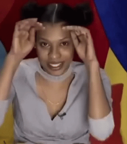 Nini from BB Naija smiling brightly, wearing a choker and blue shirt with her hair in buns.