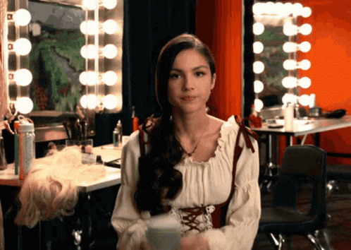Olivia Rodrigo as Nini from HSMTMTS holds up a 'Go Study!' card in a dressing room.