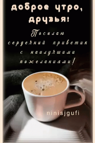 A cozy cup of coffee with foam, accompanied by a Russian 'Good morning, friends!' message from Ninisjgufi.