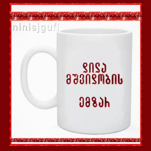 White coffee mug with red Georgian text 'Today Peace Coffee' and 'ninisjgufi' branding.