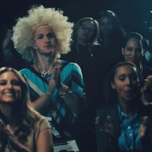 A person in a blonde afro wig and striped shirt enthusiastically claps in a crowd, showing Ninja fan appreciation.