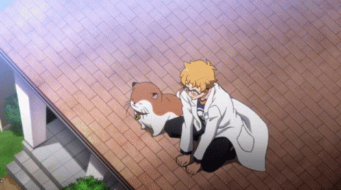 Burton and a cat relax on a roof while Ron, Goro, and Berecca watch from below in this Ninjala Anime scene.